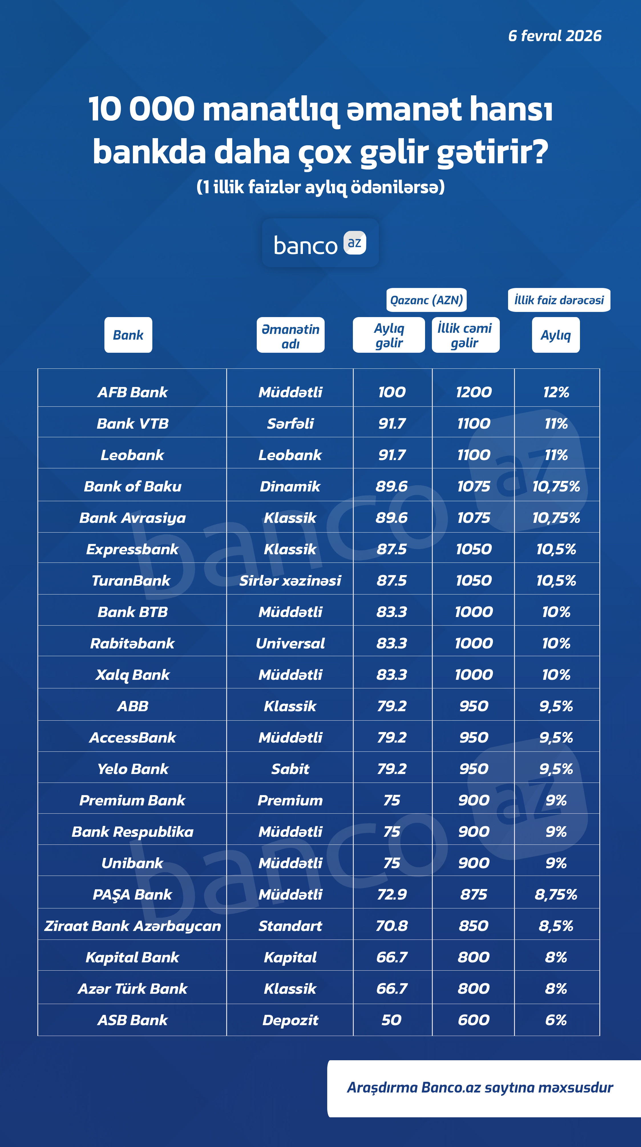 Məbləğ 10 000 manat olarsa, ən yüksək gəlir əldə edə biləcəyiniz banklar arasında AFB Bank, Bank VTB, Leobank, Bank of Baku, Bank Avrasiya var. Bu banklar illik (faizlər aylıq ödənilməklə) 10,75-12% arasında gəlirlilik təklif edirlər. Bu da 1 ilin sonunda 1075-1200 manat arasında gəlir deməkdir.