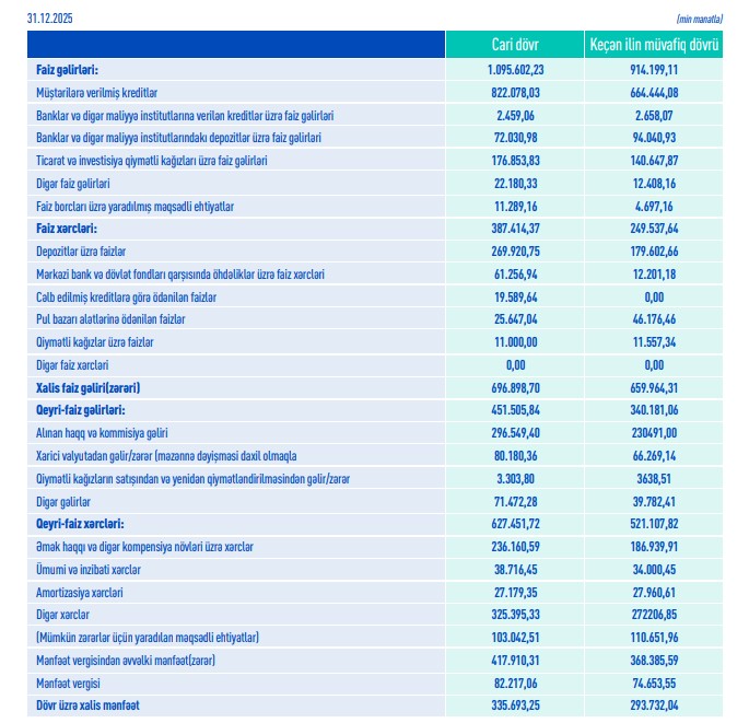 Bankın kredit porfeli isə 7 milyard 79 milyon 984 min manat təşkil edib. Bu da 2024-cü illə müqayisədə 729 milyon 183 min manat və ya 11,5% çoxdur.