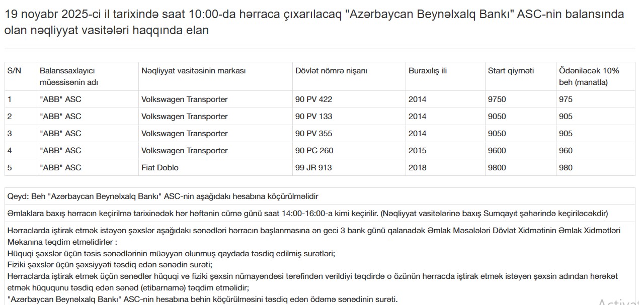 Nəqliyyat vasitələrinin start qiyməti 9 min 50 manatdan 9 min 750 manata qədərdir. Nəqliyyat vasitələrinin markaları isə "Volkswagen" (4 ədəd), "Fiat Doblo" (1 ədəd)
