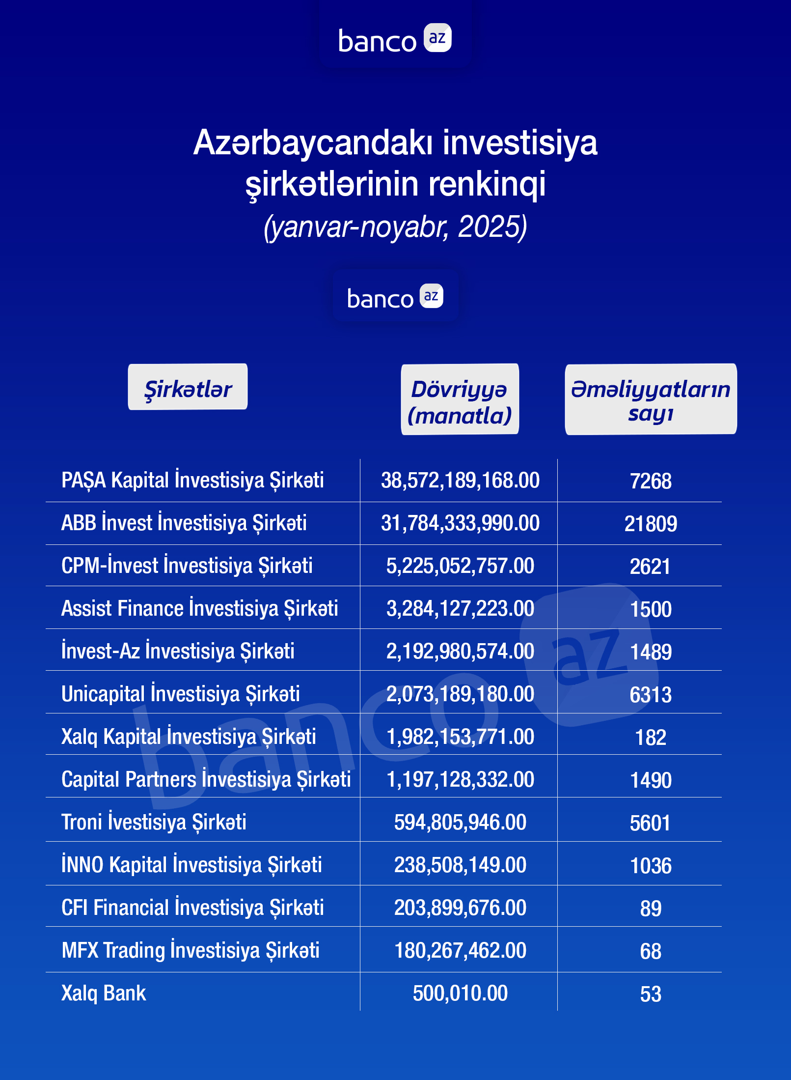 Azərbaycandakı investisiya şirkətlərinin renkinqi (Yanvar-noyabr, 2025) | Banco.az