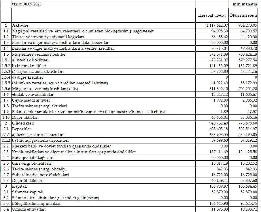 30 sentyabr 2025-ci il tarixinə bankın məcmu kapitalı 161 milyon 123 min manat təşkil edib.