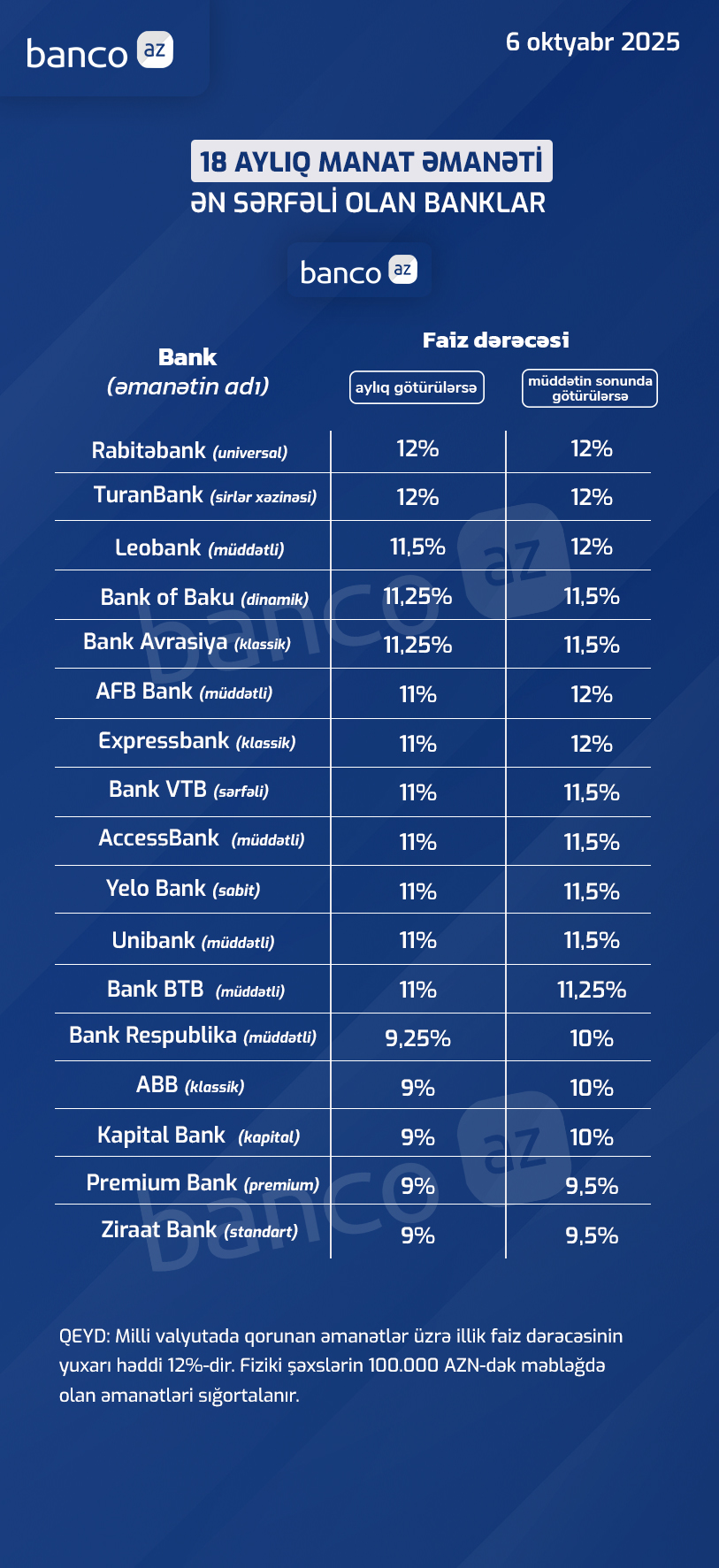 Banco.az-ın bankların oktyabr ayında 18 aylıq depozitlər üzrə faizlərini araşdırıb. Hazırda Rabitəbank və TuranBank aylıq və müddətin sonunda 12% gəlirlilik təklif edir.