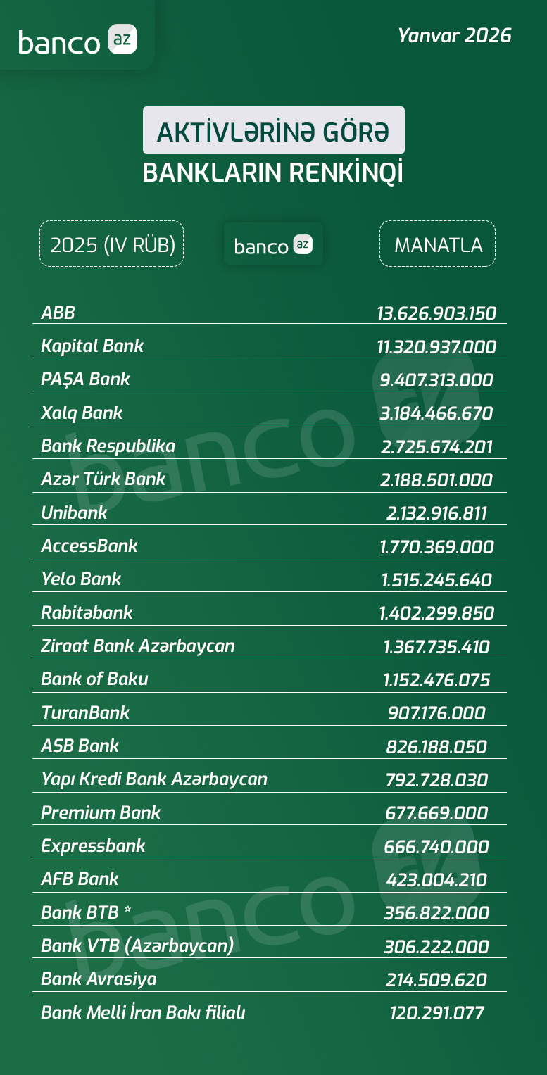 Banco.az ölkə banklarının aktivlərinin həcminə görə renkinqini hazırlayıb. Azərbaycan Beynəlxalq Bankı (13 mlrd. 626 mln. manat) siyahının ilk pilləsində qərarlaşıb. İkinci yerdə Kapital Bank (11 mlrd. 321 mln. manat), üçüncü yerdə isə PAŞA Bank-dır (9 mlrd. 407 mln. manat).