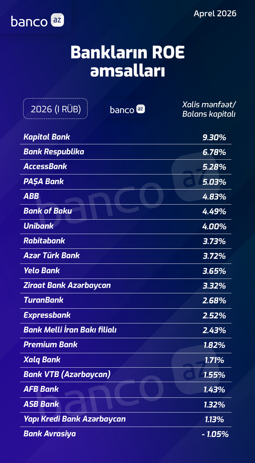 Bankların ROE əmsalı üzrə renkinqi (I rüb, 2026) Bank 21.04.2026 Ən sərfəli nağdlaşdırma hansı bankdadır? Araşdırma: Gülnar Əhmədli, Banco.az Banco.az bankların maliyyə hesabatları nəticəsində ROE (Return on Equity) göstəricisi üzrə renkinqini təqdim edir. Bizi sosial şəbəkələrdən izləyin!! Facebook Instagram Telegram Banco.az Play Market-də Müəllif: Gülnar Əhmədli KREDİT SİFARİŞ ET Bizi Telegram-da izlə!