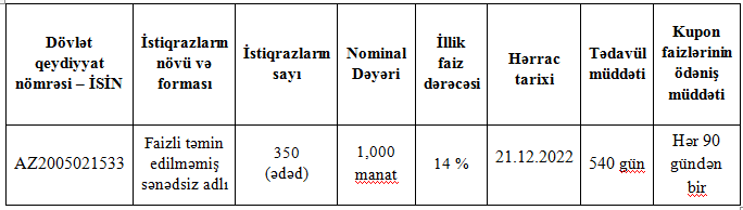 21 dekabr 2022-ci il tarixində qeyd olunan istiqrazların yerləşdirilməsi Bakı Fond Birjasında birqiymətli hərrac üsulu ilə həyata keçiriləcəkdir.