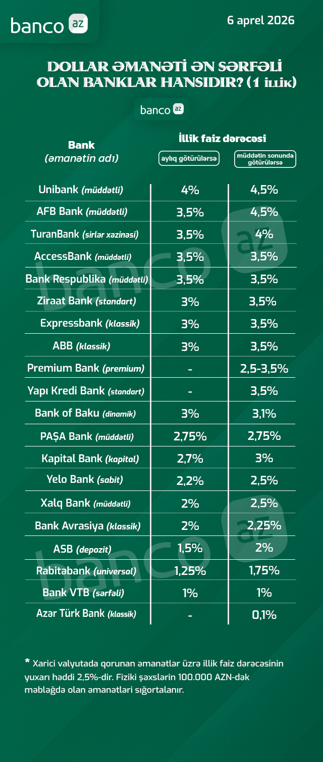 Banco.az bankların aprel ayı üzrə bir il müddətinə dollarla yerləşdirilən depozitlərə aylıq və müddətin sonunda təklif etdiyi illik faiz dərəcələri ilə bağlı cədvəl hazırlayıb. Hazırda əksər bankların faizləri qorunan əmanətlərin yuxarı faiz həddindən yüksəkdir. Ən yüksək faizləri Unibank təklif edir.