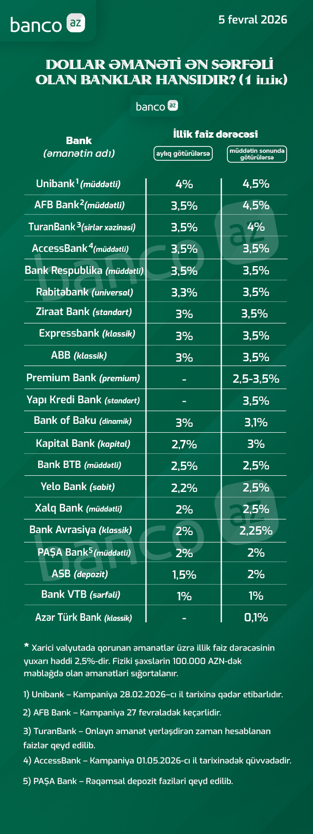 Banco.az bankların fevral ayı üzrə bir il müddətinə dollarla yerləşdirilən depozitlərə aylıq və müddətin sonunda təklif etdiyi illik faiz dərəcələri ilə bağlı cədvəl hazırlayıb. Hazırda əksər bankların faizləri qorunan əmanətlərin yuxarı faiz həddindən yüksəkdir. Ən yüksək faizləri Unibank təklif edir.