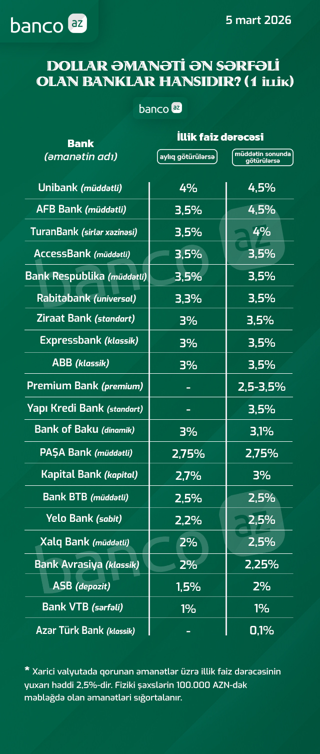Banco.az bankların mart ayı üzrə bir il müddətinə dollarla yerləşdirilən depozitlərə aylıq və müddətin sonunda təklif etdiyi illik faiz dərəcələri ilə bağlı cədvəl hazırlayıb. Hazırda əksər bankların faizləri qorunan əmanətlərin yuxarı faiz həddindən yüksəkdir. Ən yüksək faizləri Unibank təklif edir.