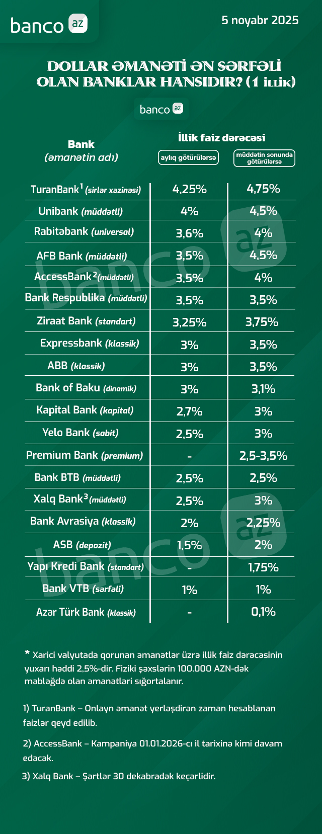 Banco.az bankların noyabr ayı üzrə bir il müddətinə dollarla yerləşdirilən depozitlərə aylıq və müddətin sonunda təklif etdiyi illik faiz dərəcələri ilə bağlı cədvəl hazırlayıb. Hazırda əksər bankların faizləri qorunan əmanətlərin yuxarı faiz həddindən yüksəkdir. Ən yüksək faizləri TuranBank və Unibank təklif edir.