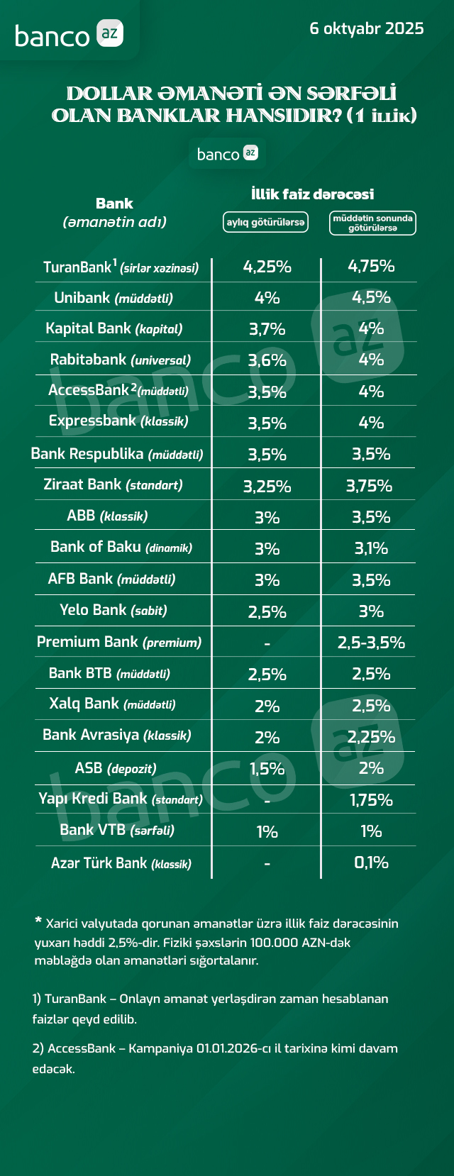 Banco.az bankların oktyabr ayı üzrə bir il müddətinə dollarla yerləşdirilən depozitlərə aylıq və müddətin sonunda təklif etdiyi illik faiz dərəcələri ilə bağlı cədvəl hazırlayıb. Hazırda əksər bankların faizləri qorunan əmanətlərin yuxarı faiz həddindən yüksəkdir. Ən yüksək faizləri TuranBank və Unibank təklif edir.