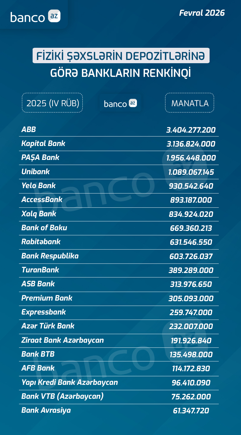 Əhali depozitini ən çox hansı banka yatırır? Bank 18.02.2026 Ən sərfəli nağdlaşdırma hansı bankdadır? Araşdırma: Gülnar Əhmədli, Banco.az Banco.az ölkə banklarının fiziki şəxslərin depozit portfelinin həcminə (IV rüb, 2025) görə renkinqini hazırlayıb. Siyahı aşağıdakı kimidir: Bizi sosial şəbəkələrdən izləyin!! Facebook Instagram Telegram Banco.az Play Market-də Müəllif: Gülnar Əhmədli KREDİT SİFARİŞ ET Bizi Telegram-da izlə!