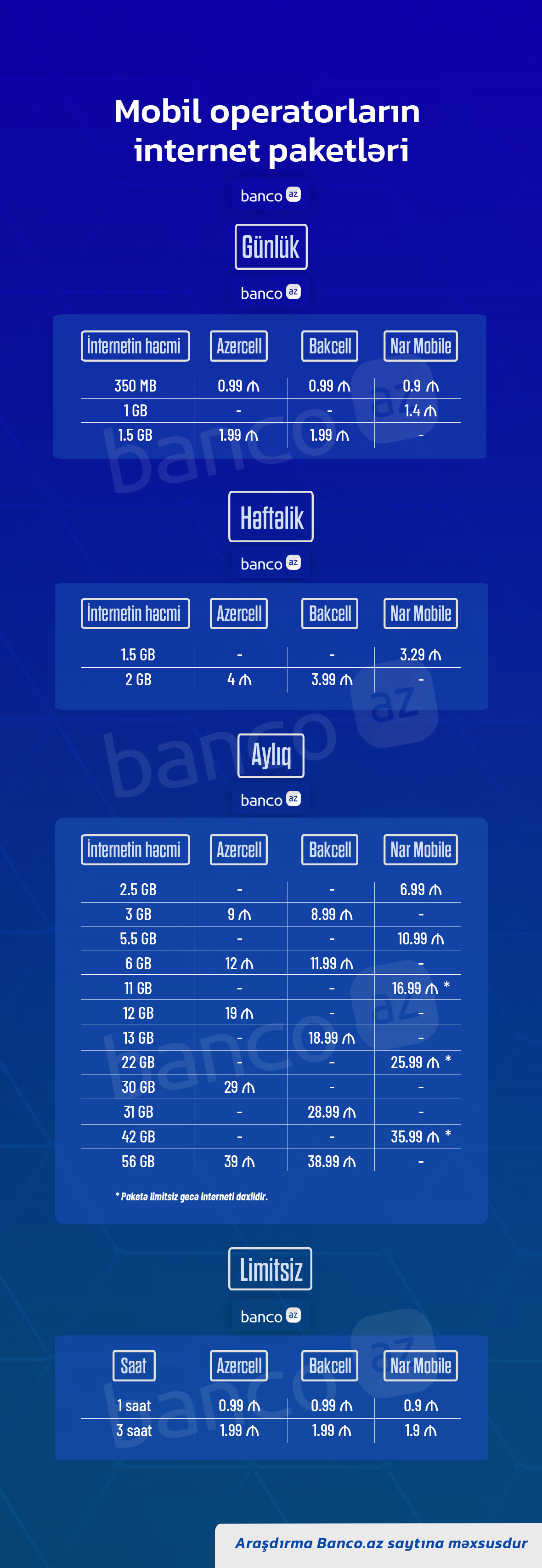 Banco.az Azərbaycanda fəaliyyət göstərən 3 mobil operatorun (Azercell, Bakcell və Nar Mobile) təklif etdiyi internet paketlərini (günlük, həftəlik, aylıq) araşdırıb.