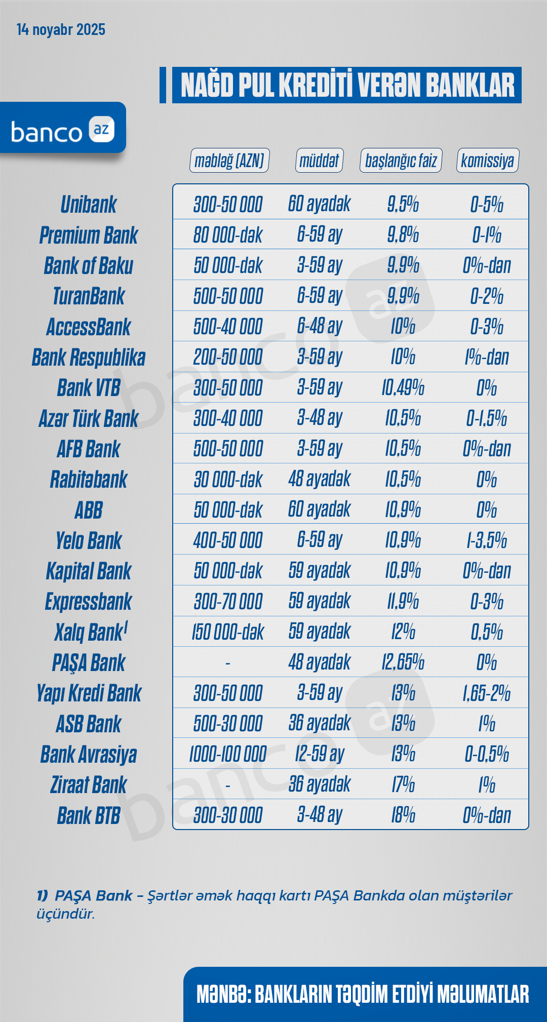Qeyd edək ki, cədvəldə verilən şərtlər (faizlər, müddət və məbləğ) bankların ümumi məlumatlarıdır. Bu şərtlər əmək haqqının məbləğindən, təminatdan, müddətdən və s. asılı olaraq dəyişə bilər.