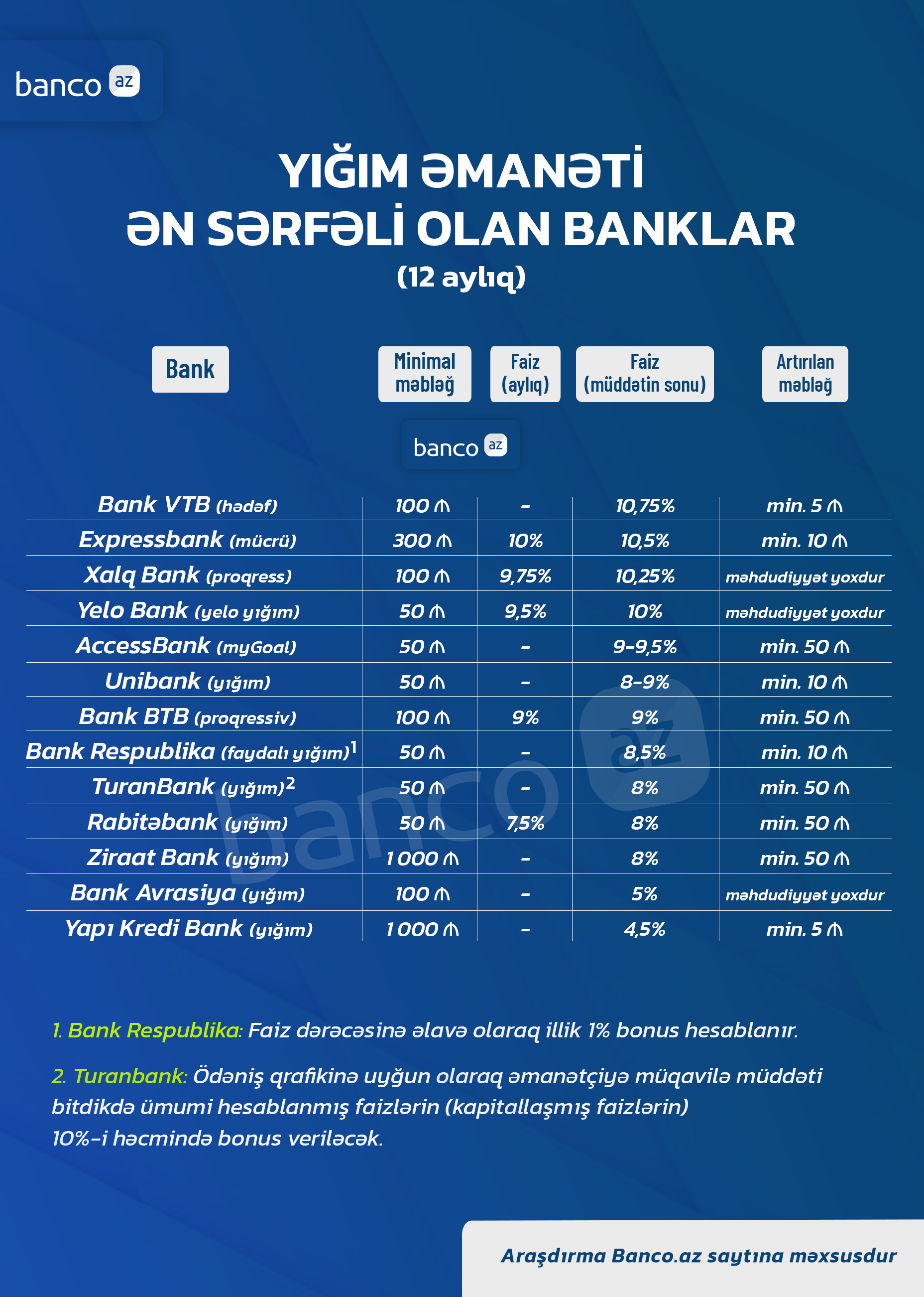 Cədvəldə 12 aylıq müddətdə olan yığım əmanətləri qeyd olunub. Bir neçə bank istisna olmaqla, digərlərində əmanət faizləri müddətin sonunda götürülür.