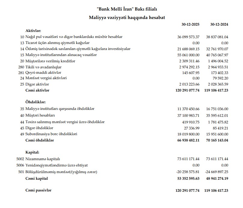 Qeyd edək ki, 2024-cü ilin 31 dekabr tarixində Bank Melli İran-ın aktivlərinin həcmi isə 119 milyon 106 min manata bərabər olub.