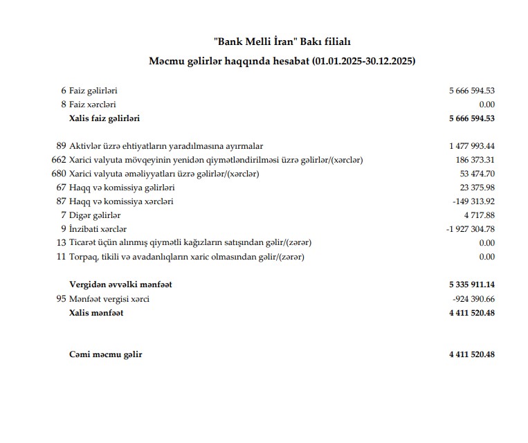 Bank Melli İran-ın Bakı filialı 2025-ci ildə 4 milyon 412 min manat xalis mənfəət əldə edib. Bu, illik müqayisədə 3 milyon 304 min manat və ya 42,8% azdır. 2024-cü ildə bankın mənfəəti 7 milyon 716 min manat təşkil edib.