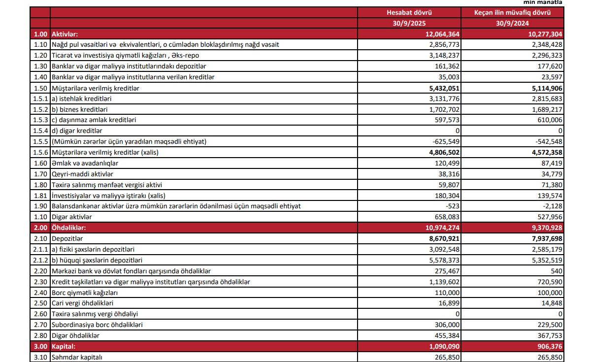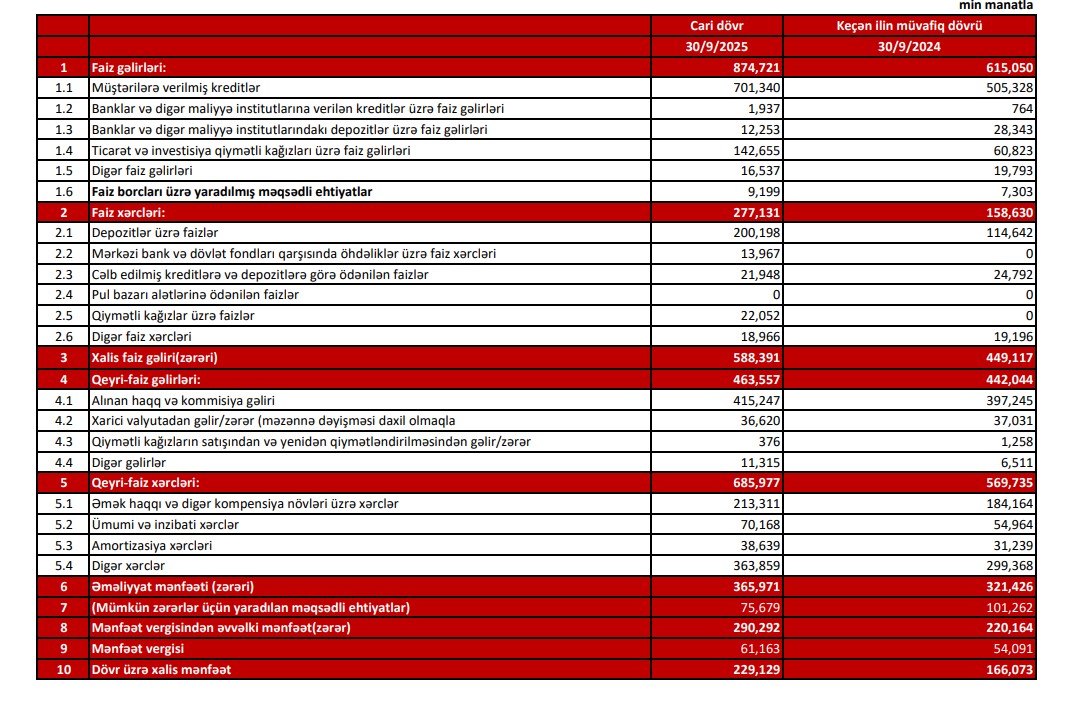 "Kapital Bank"ın xalis mənfəəti 2025-ci ilin 30 sentyabr tarixinə 229 milyon 129 min manat təşkil edib. Bankın xalis mənfəəti illik müqayisədə 63 milyon 56 min manat və ya 38% artıb.