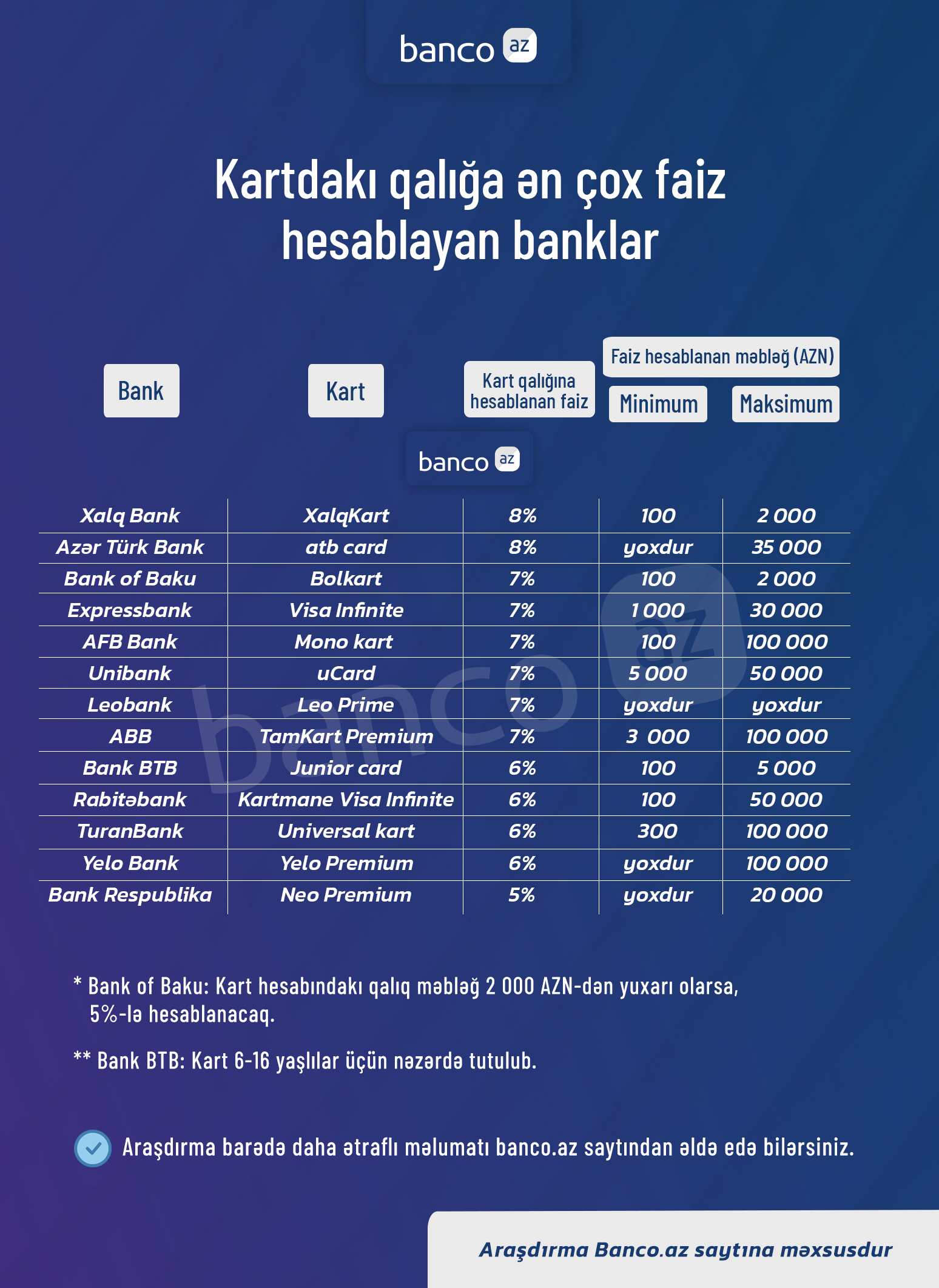 Faizlər gündəlik hesablanır və cari ayın son iş günündə kartın balansına köçürülür. Kartın faiz hesablanan gündəlik minimal qalıq məbləği 100 AZN, maksimal qalıq məbləği isə 2000 AZN-dir.