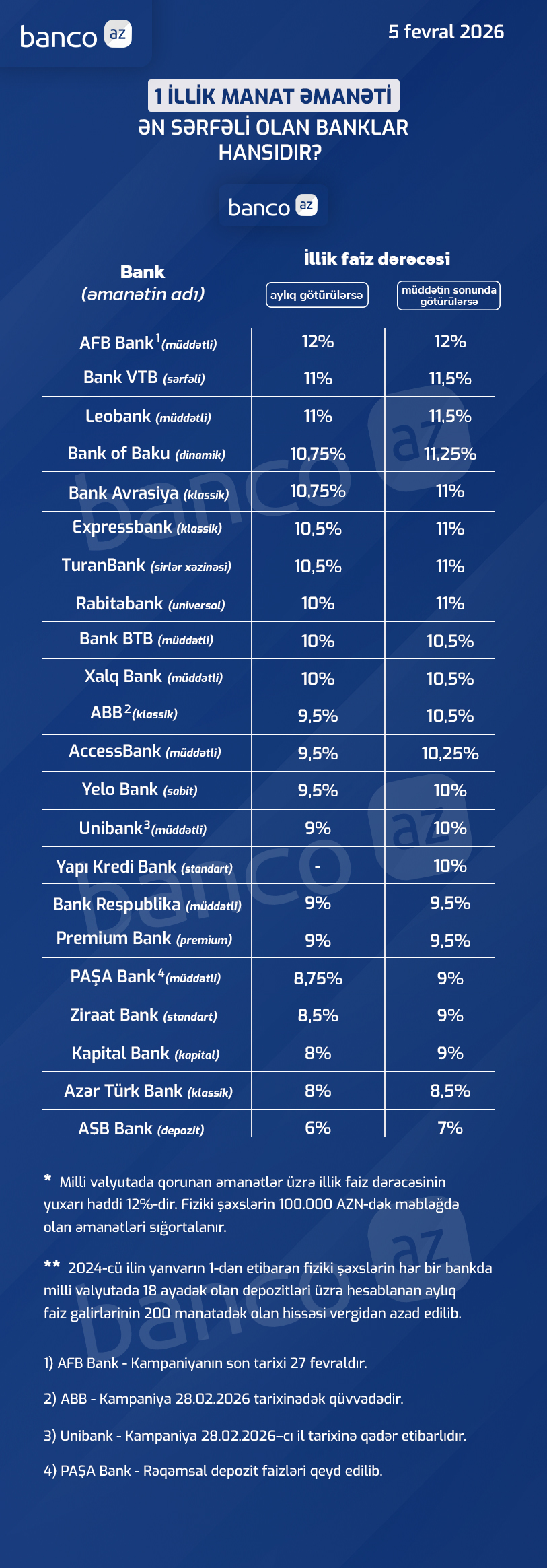 Banco.az bankların 2026-cı ilin fevral ayı üzrə təklif etdikləri depozit faizlərini araşdırıb.
