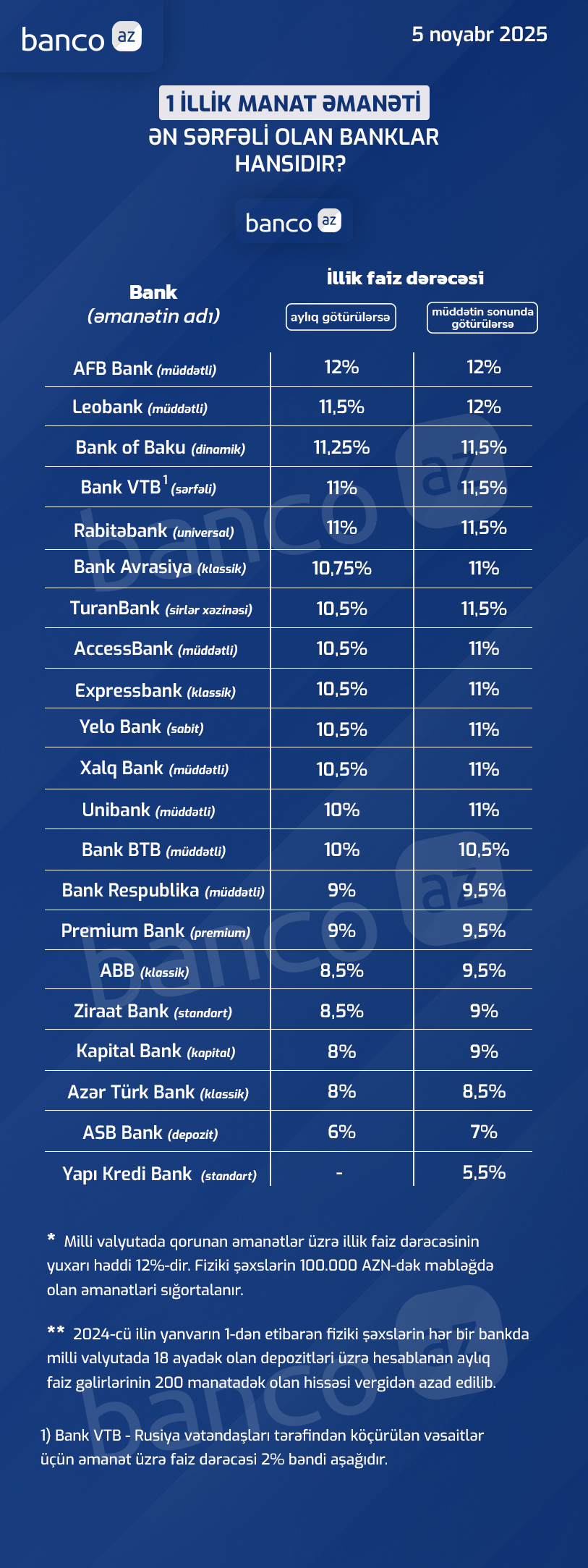 Banco.az bankların 2025-ci ilin noyabr ayı üzrə təklif etdikləri depozit faizlərini araşdırıb.