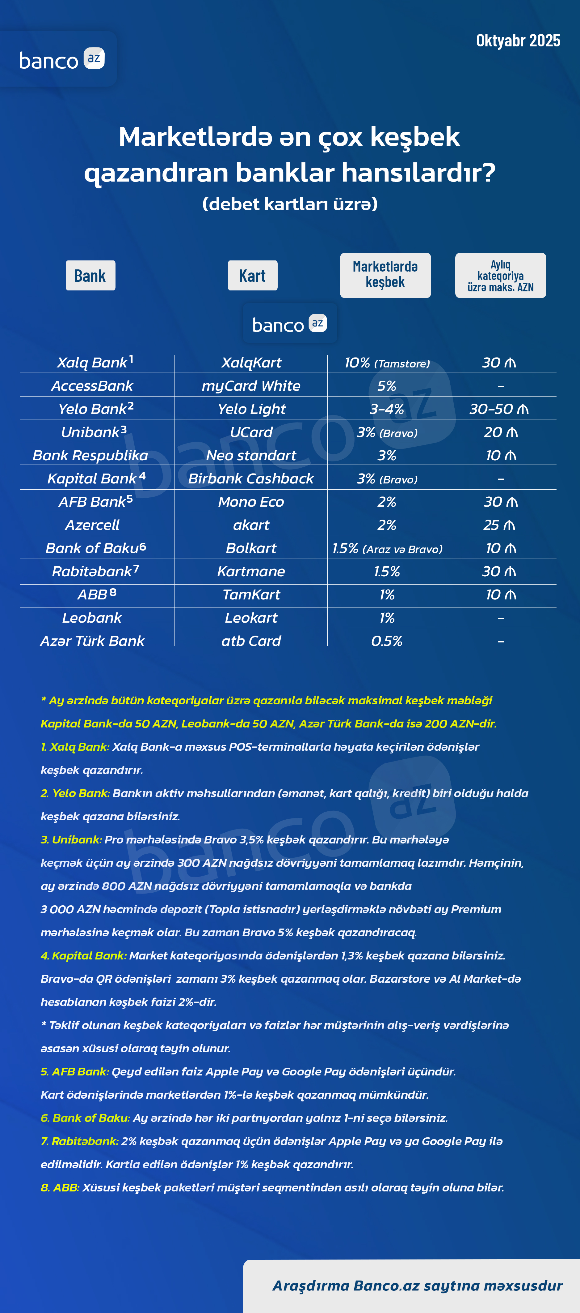 Ərzaq xərcləri gündəlik alış-verişimizin əsas hissələrindən birini təşkil etdiyi üçün bu kateqoriyada hər ay hansı bankın daha yüksək faiz təklif etdiyi hər kəsə maraqlı olur. Bu səbəblə bankların marketlər üçün təqdim etdikləri keşbek faizlərini və bu kateqoriya üzrə qazanıla biləcək maksimal keşbek məbləğini araşdırdıq.