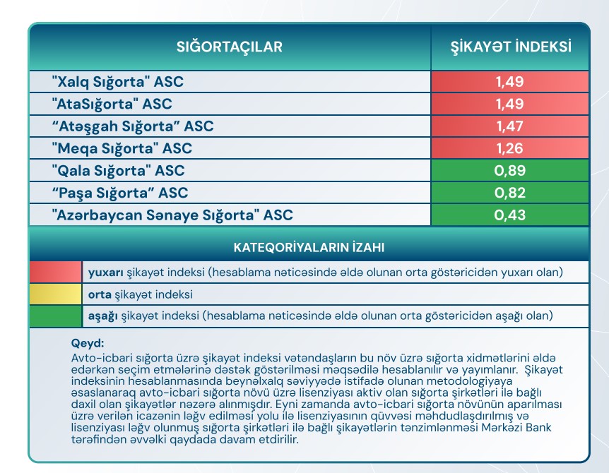 Azərbaycanda son 1 ildə (1 yanvar-31 dekabr 2025) avtomobillərin icbari sığortası üzrə ən çox şikayət edilən şirkətlər 1.49 indekslə "Xalq Sığorta" və "AtaSığorta" olub.