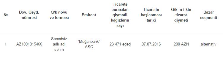 02 iyul 2015-ci il tarixindən etibarən BFB-nin Listinq Komitəsinin qərarı ilə “Muğanbank” ASC -nin qiymətli kağızları BFB-də alternativ bazar seqmentində listinqə daxil edilibr: