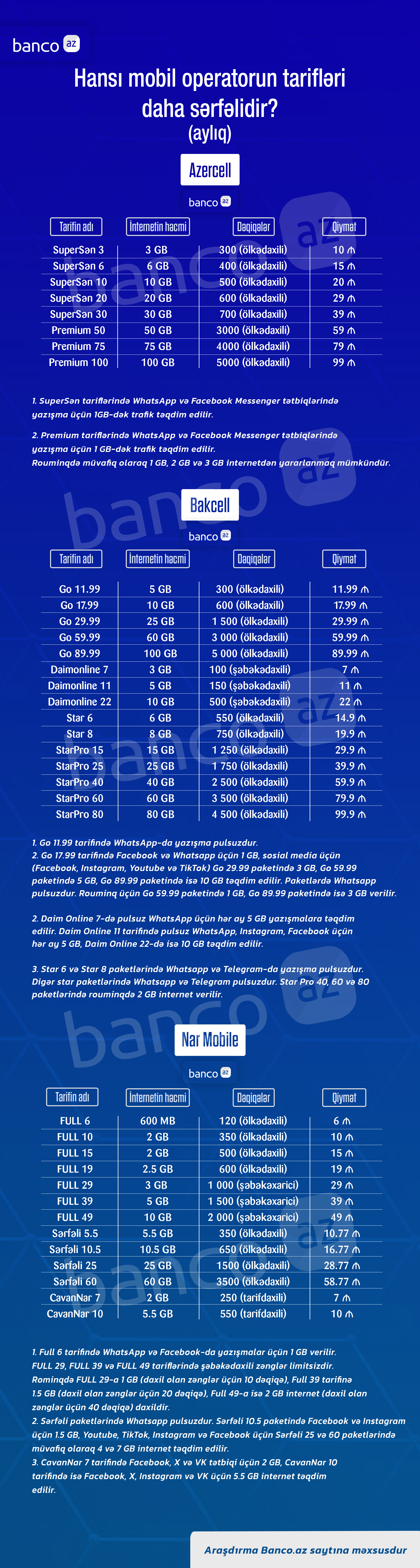 Araşdırmamıza görə, ölkədə fəaliyyət göstərən 3 operatorun da hər büdcəyə uyğun tarifləri var. Bonuslu tariflərdə minimum qiymət 6 manat, maksimum qiymət isə 99.9 manatdır.