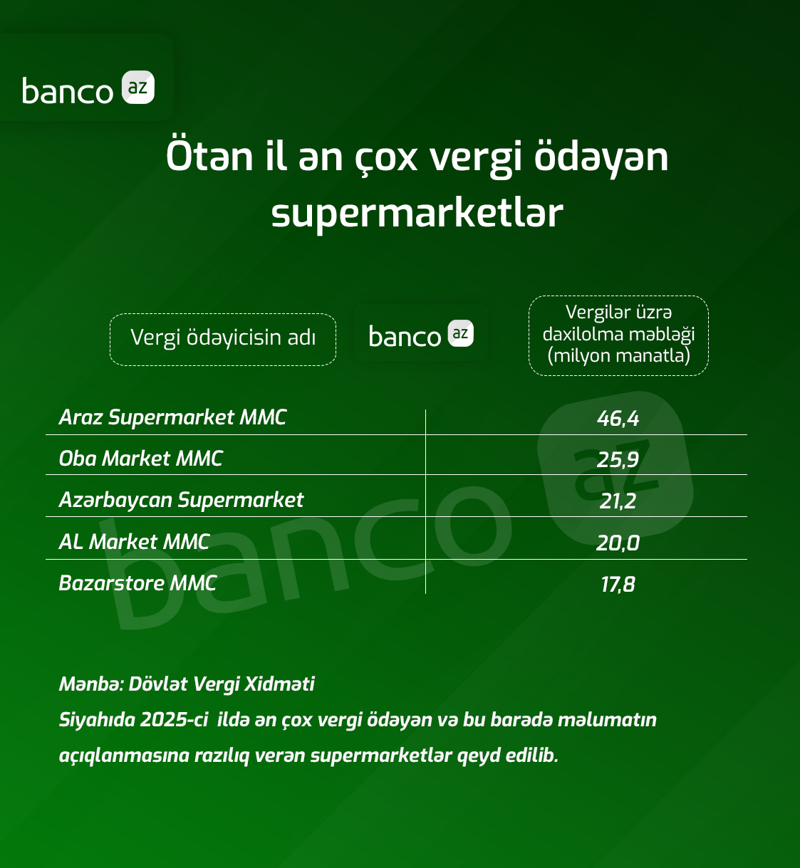 Banco.az Dövlət Vergi Xidmətinə istinadən xəbər verir ki, ən çox vergi ödəyən 100 hüquqi şəxsin siyahısında supermarketlər da var. Həminmarketlər aşağıdakılardır: