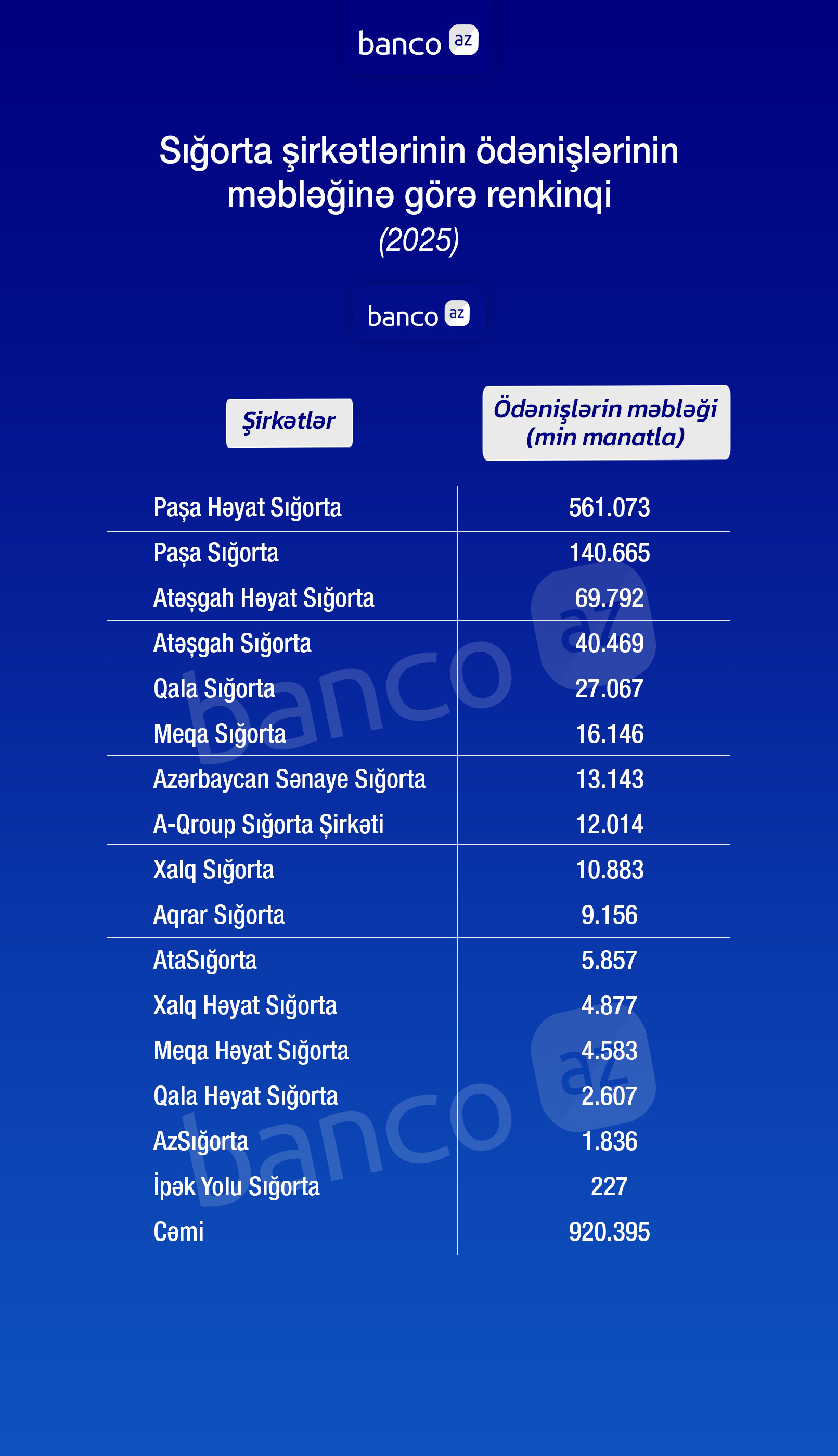 Banco.az sığorta şirkətlərinin ödənişlərinin məbləğinə görə renkinqini təqdim edir: