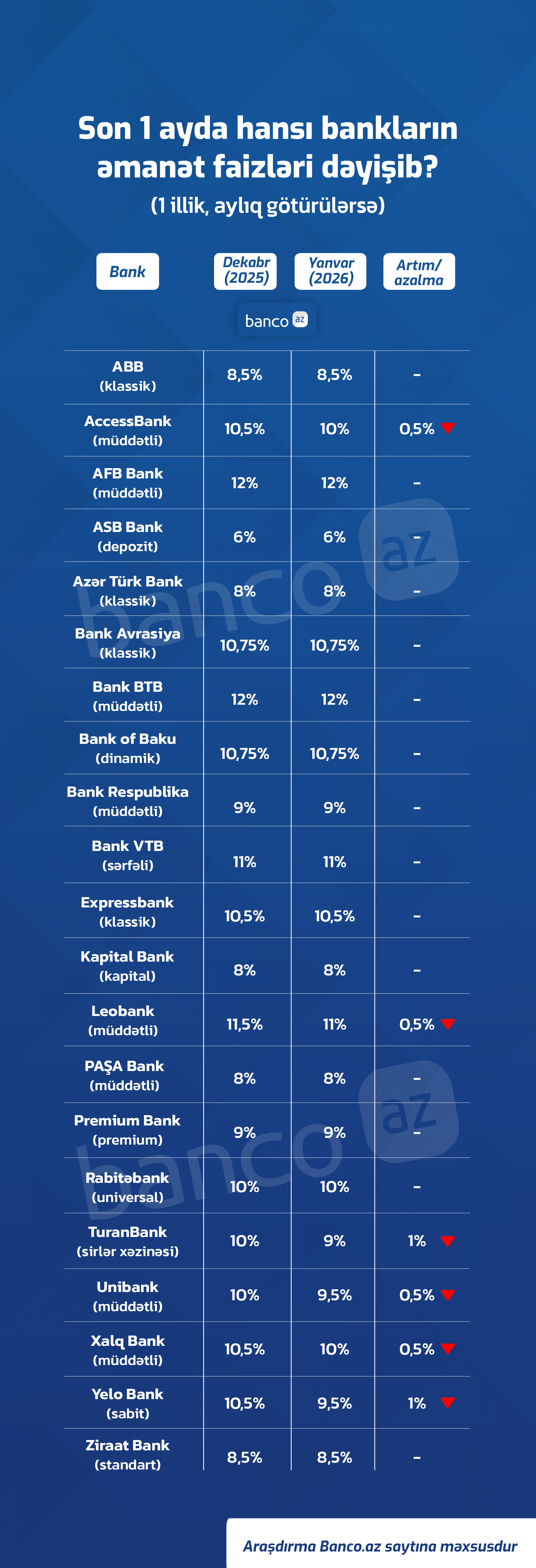 Onu da qeyd edək ki, cədvəldə yalnız depozit aylıq götürülərkən təqdim olunan faizlər (müddətin sonunda faizlər: Yanvarda bu bankların əmanət faizləri azalıb) qeyd olunub.