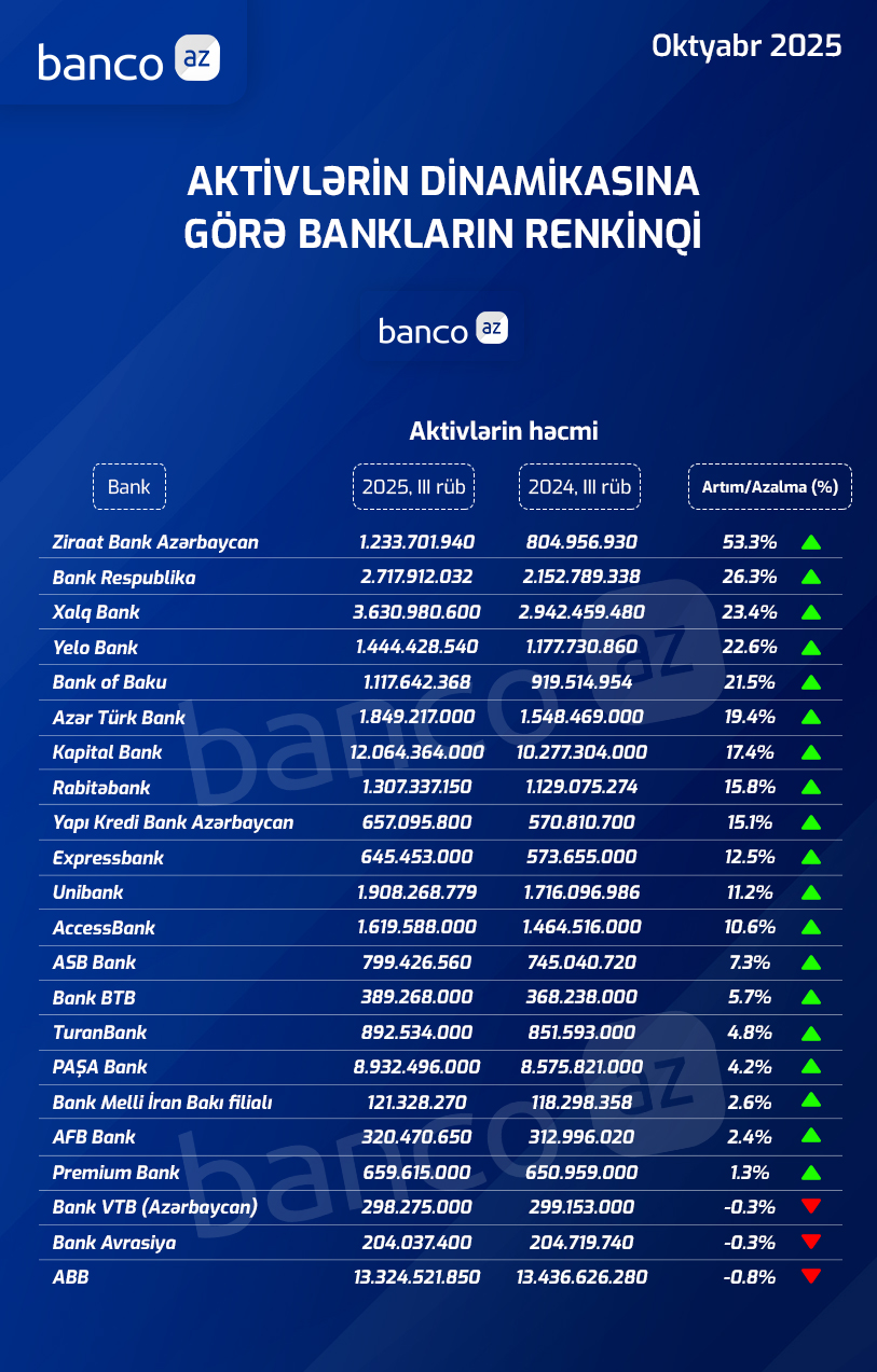 Bankların açıqladığı göstəricilərə əsasən, Azərbaycan Beynəlxalq Bankı (ABB) aktivlərinin həcminə görə ölkə bankları sırasında 1-ci yerdədir. Ən az aktivi olan bank isə Bank Melli İran Bakı filialı-dır. Tam siyahı ilə linkə keçid edərək tanış ola bilərsiniz.