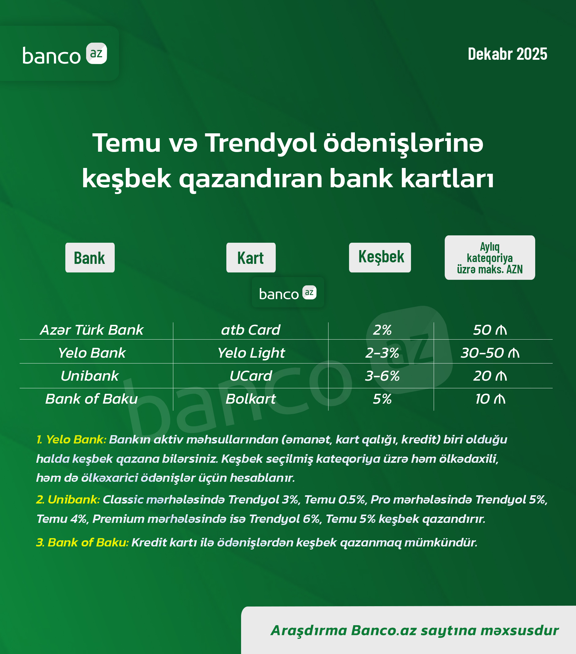 Hazırda 4 bank Temu və Trendyol ödənişlərinə keşbek qazandırır. Bunlar Azər Türk Bank, Yelo Bank, Unibank və Bank of Baku-dur. Ən yüksək faiz 6%-lə Unibank-dadır. 6%-i isə Premium mərhələsinə keçdikdən sonra qazanmaq mümkündür. Digər banklarda faizlər 2-5% arasında dəyişir.