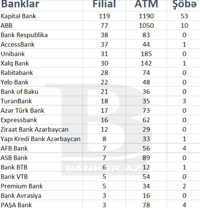 Qeyd edək ki, hazırda Azərbaycanda 22 bank fəaliyyət göstərir. Xidmət şəbəkəsinin genişliyi istiqamətində isə liderlik Kapital Bankdadır. Bankın ölkə üzrə 119 filialı, 53 şöbəsi və 1190 bankomatı var. Bu göstərici ilə Kapital Bank maliyyə sektorunda birinci yeri tutur. Eyni zamanda ölkənin hər yerində müştəriyə ən yaxın bank imicini möhkəmləndirir. Siyahıda maliyyə sektorunun əsas simalarından biri olan ABB 77 filial, 10 şöbə və 1050 bankomatla 2-ci, Bank Respublika isə 38 filial, 83 ATM ilə 3-cü yerdə qərarlaşır.