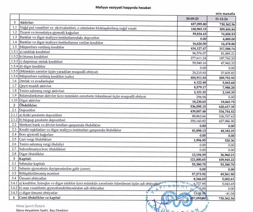 30 sentyabr tarixinə bankın depozit portfeli 439 milyon 7 min manat təşkil edib. Depozitlərin 88 milyon 863 min manatı fiziki şəxslərin, 350 milyon 144 min manatı isə hüquqi şəxslərin depozitləri olub.