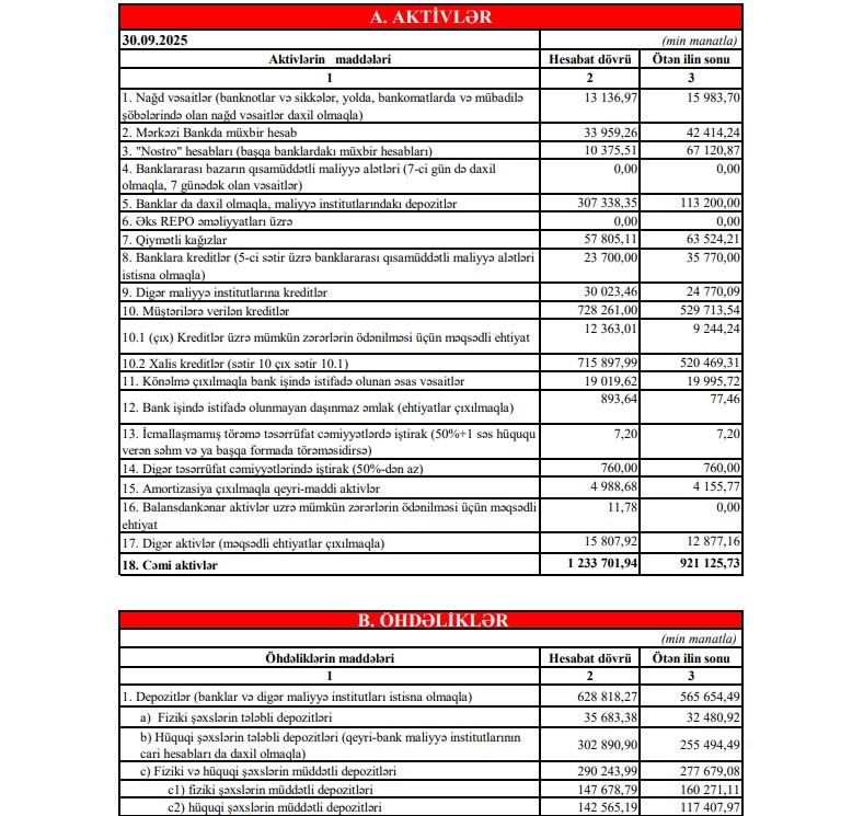 Bankın kredit portfeli də bu ilin əvvəli ilə müqayisədə 198 milyon 547 min manat və ya 37,5% artaraq 728 milyon 261 min manata çatıb. Depozit portfeli isə 628 milyon 818 min manata yüksəlib ki, bu da ötən ilin sonunun nəticələri ilə müqayisədə 63 milyon 164 min manat və ya 11,2% artımdır.