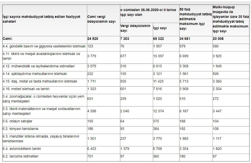 Qurum həmin fəaliyyət sahələri, orada çalışan vergi ödəyiciləri, onların işçi sayı və tətbiq edilən məhdudiyyətlərlə bağlı məlumatları açıqlayıb.