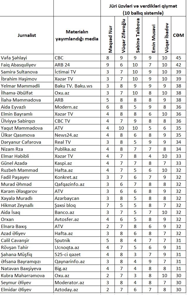 Münsif üzvlər öz ballarını digər jüri həmkarlarının kim olmasından xəbərsiz formada veriblər. Müsabiqənin təşkilati işlərini icra edən “INPPRESS PR Solutions” şirkəti jüri üzvlərin verdiyi balları bir yerdə toplayaraq son nəticəni hesablayıb.